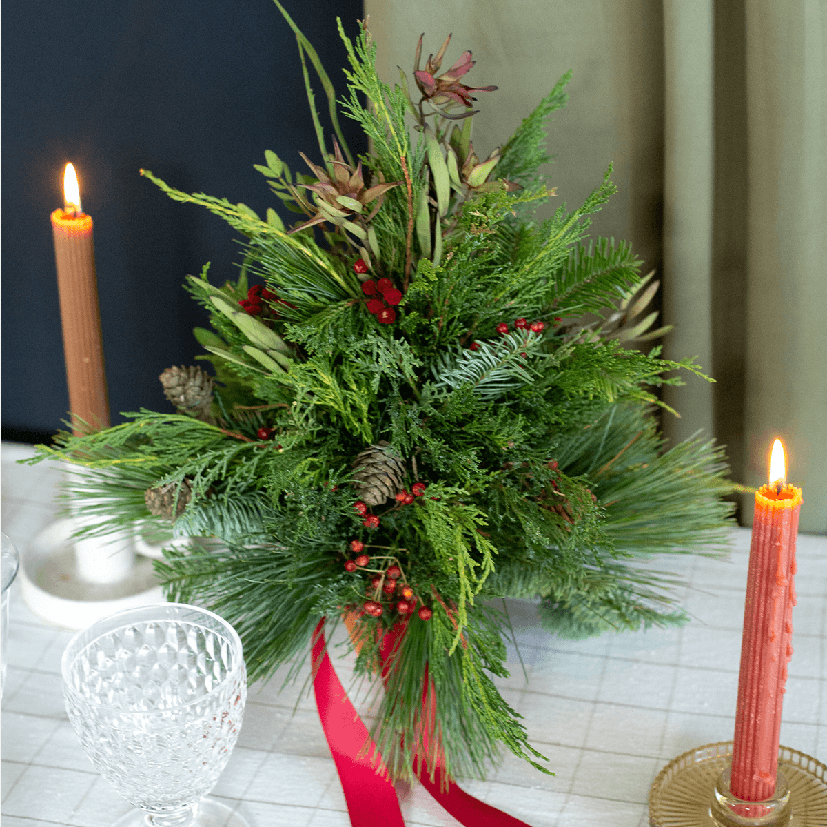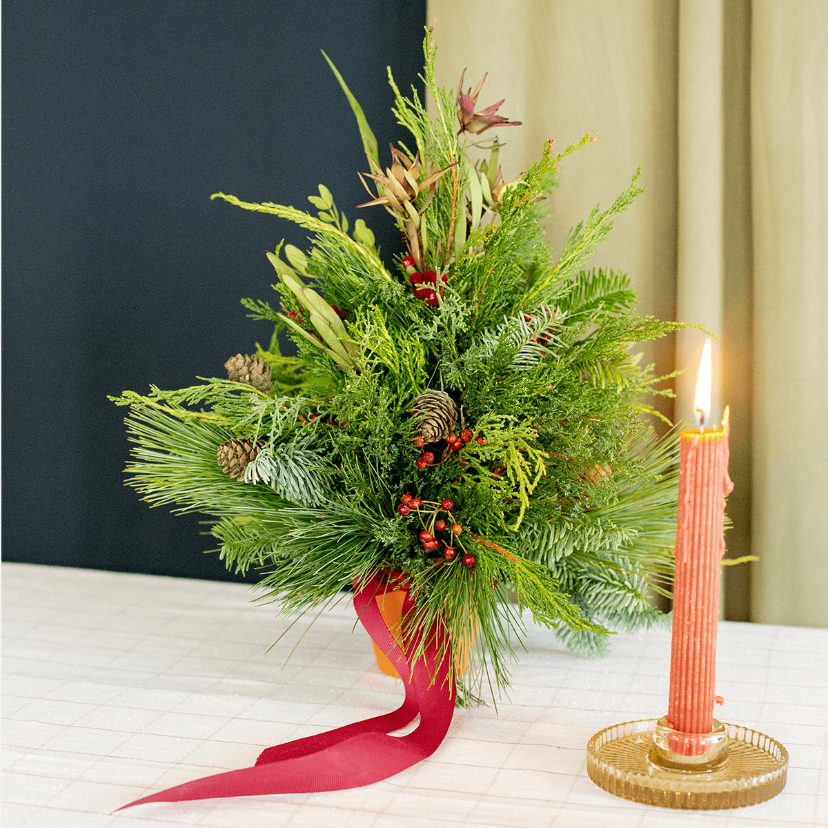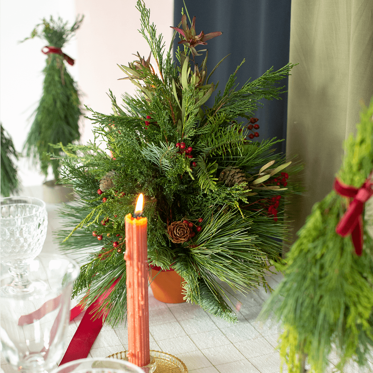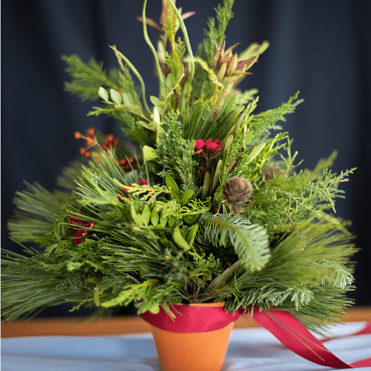 Kompozycja w kształcie choinki, idealna na świąteczny stół. Wykonana na bazie naturalnego igliwia, które się nie sypie – jodły nobilis, sosny i jałowca. Z szyszkami i dodatkami w kolorze czerwieni. Podstawę stanowi terakotowa mini doniczka przewiązana czerwoną wstążką.